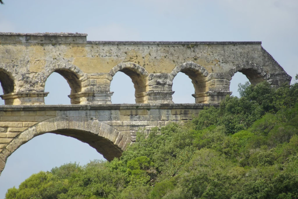 Le chemin nous emmène vers des points de vue insolites sur le Pont du Gard, le long de l’aqueduc ruiné. Nous remarquons régulièrement des morceaux de canalisations. Tout le monde est émerveillé par le travail titanesque des romains.
